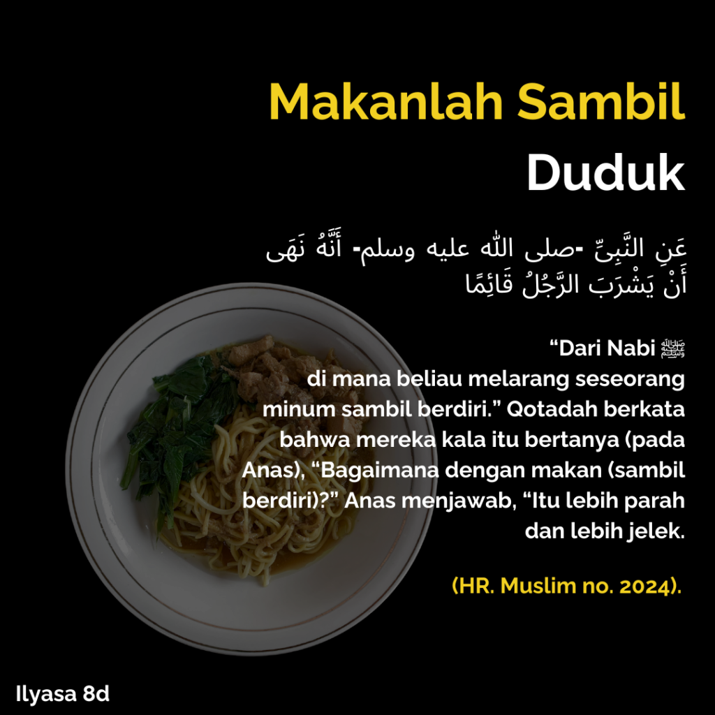 The poster titled “Makanlah Sambil Duduk” emphasizes the Islamic teaching that discourages eating or drinking while standing. It references a hadith from Prophet Muhammad (peace be upon him), where he advised against drinking while standing. The poster includes a narration from Qotadah, who mentioned that eating while standing is considered worse and more improper. This serves as a reminder to follow the Sunnah by sitting while consuming food or drink. The design likely combines text and visuals to convey this message effectively.